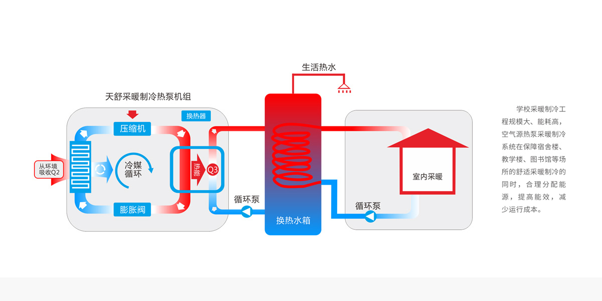 根据教学楼、宿舍、图书馆等设施的采暖制冷时间,制定方案,合理选型,减少成本。